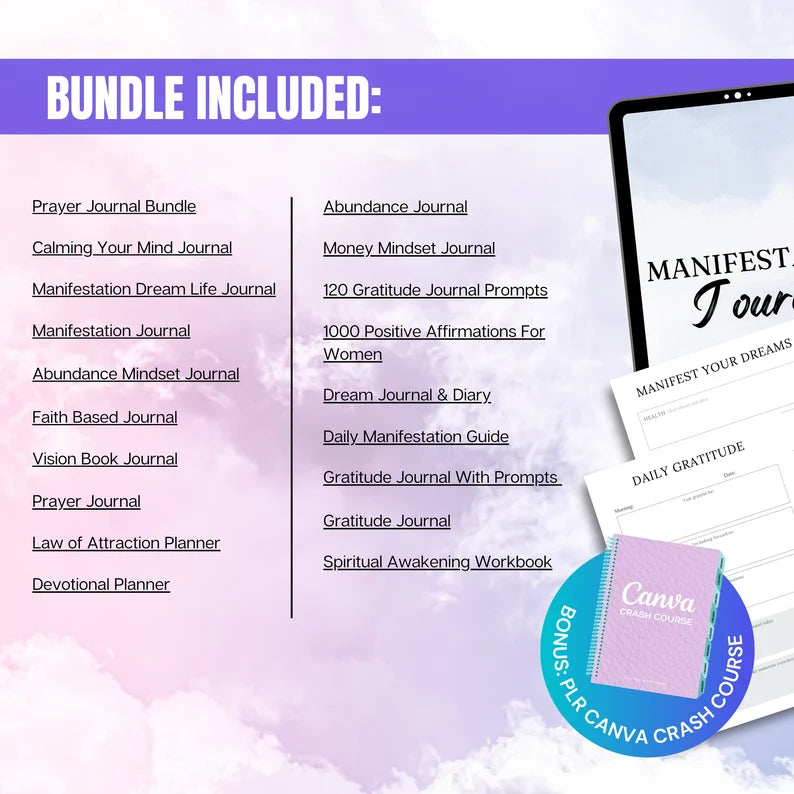 Whether you're looking to enhance your personal growth journey, guide others in their manifestation practices, or expand your digital product offerings, this bundle is perfect for you. The included digital products cover a wide range of manifestation topics, making it a valuable resource for anyone interested in the field.